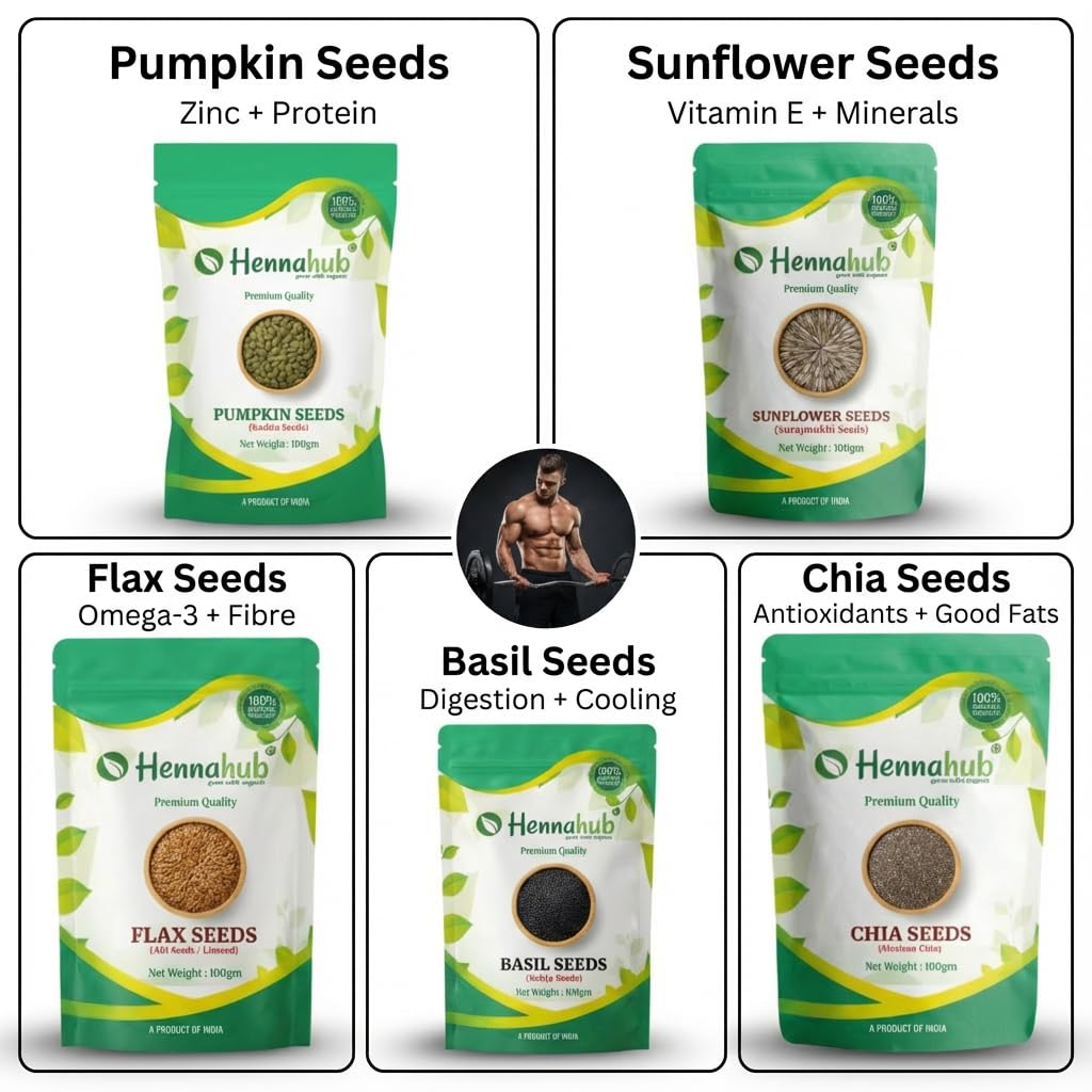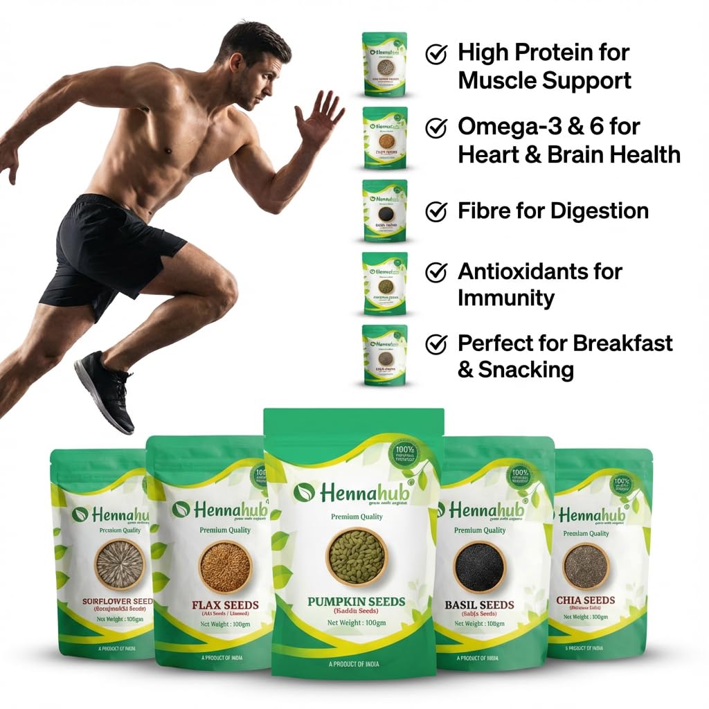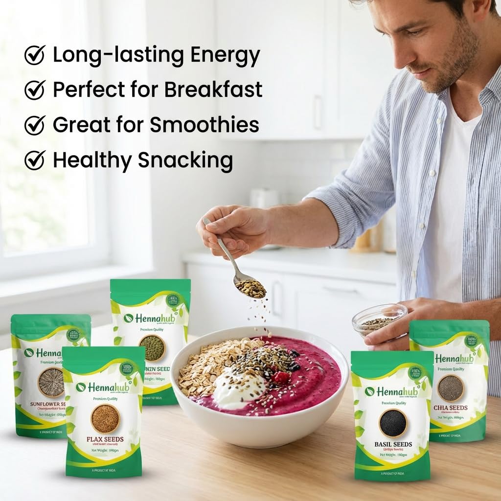 Upgrade your nutrition with the Hennahub 5-in-1 Super Seeds Power Combo , a premium assortment of Pumpkin Seeds, Sunflower Seeds, Flax Seeds, Chia Seeds and Basil Seeds . Each seed type is hygienically packed in 5 individual 100g packs to preserve freshness, crunch and purity.