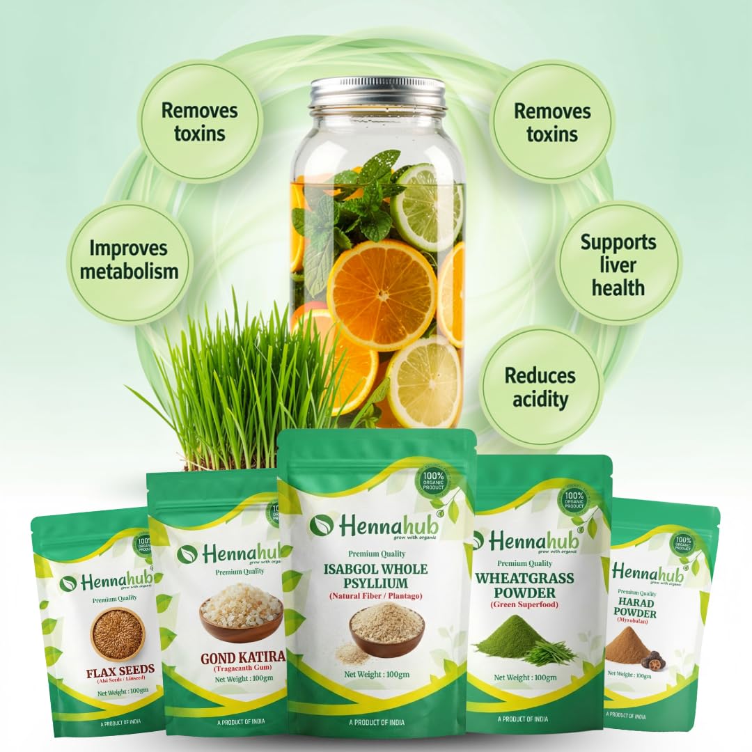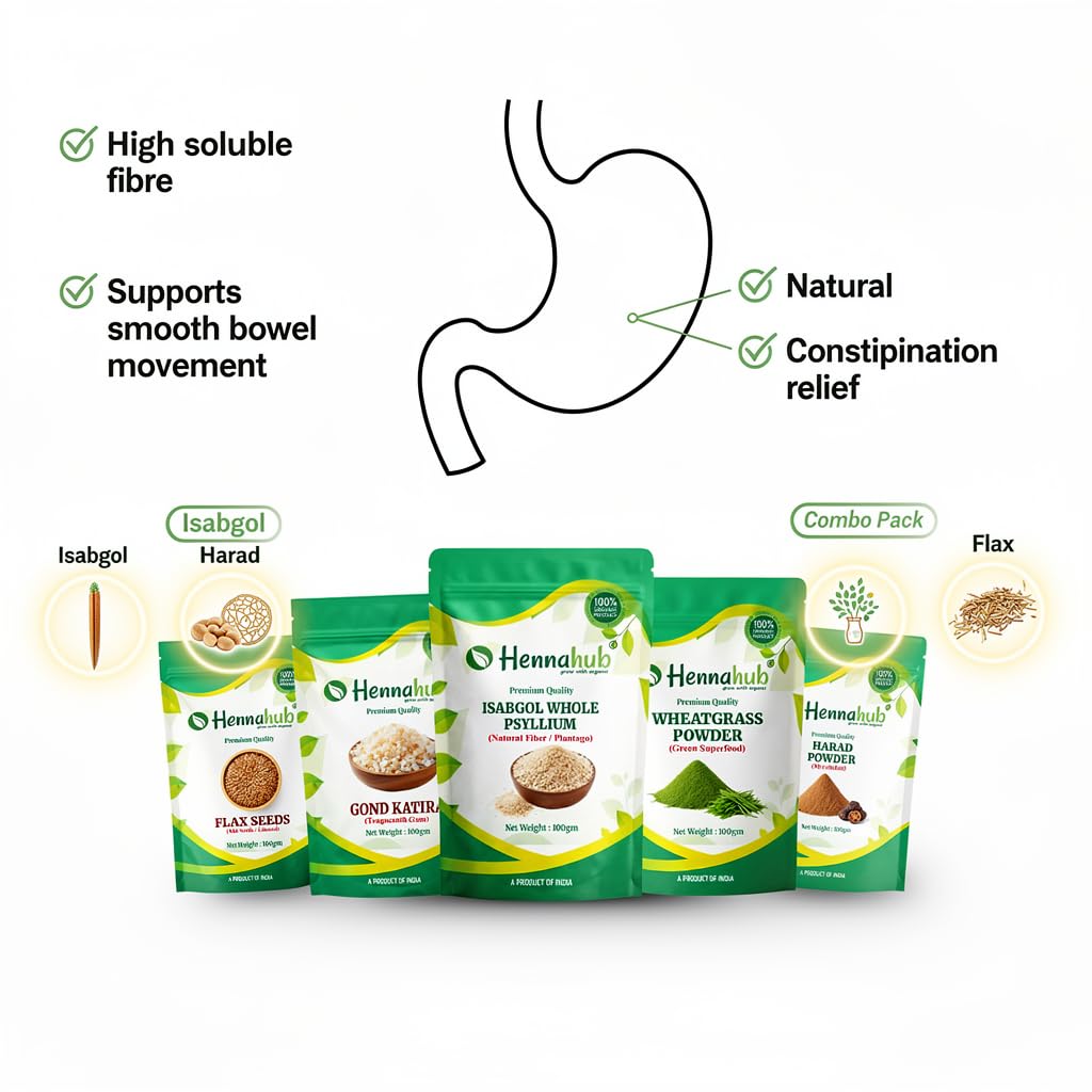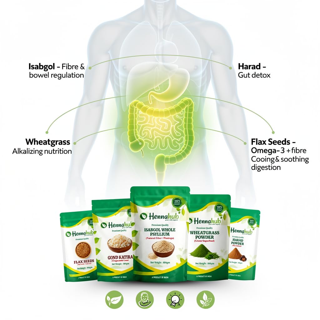 Hennahub Complete Digestive Wellness Combo | Isabgol Husk, Harad  and Wheatgrass Powder, Flax Seeds & Gond Katira | Pack of 5 × 100g | Gut Health, Digestion, Detox, Constipation Relief & Daily Fibre Support