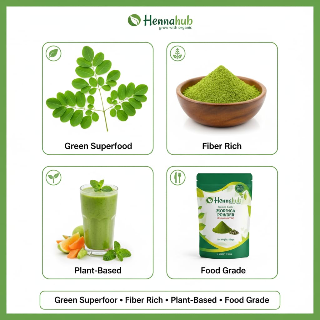 Hennahub Moringa Powder (Food Grade) is made from premium Moringa Oleifera leaves, naturally shade-dried to preserve color, aroma, and nutrition. This green superfood can be easily mixed into smoothies, juices, soups, or herbal drinks for daily nourishment.