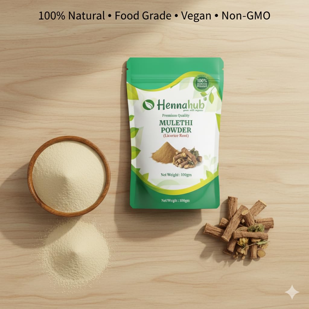Hennahub Mulethi Powder (Food Grade) 100gm Pack is made from 100% pure and naturally sun-dried roots of Glycyrrhiza glabra (Licorice Root). It's a versatile, plant-based ingredient with a mild sweet taste, suitable for teas, herbal drinks, or food recipes.