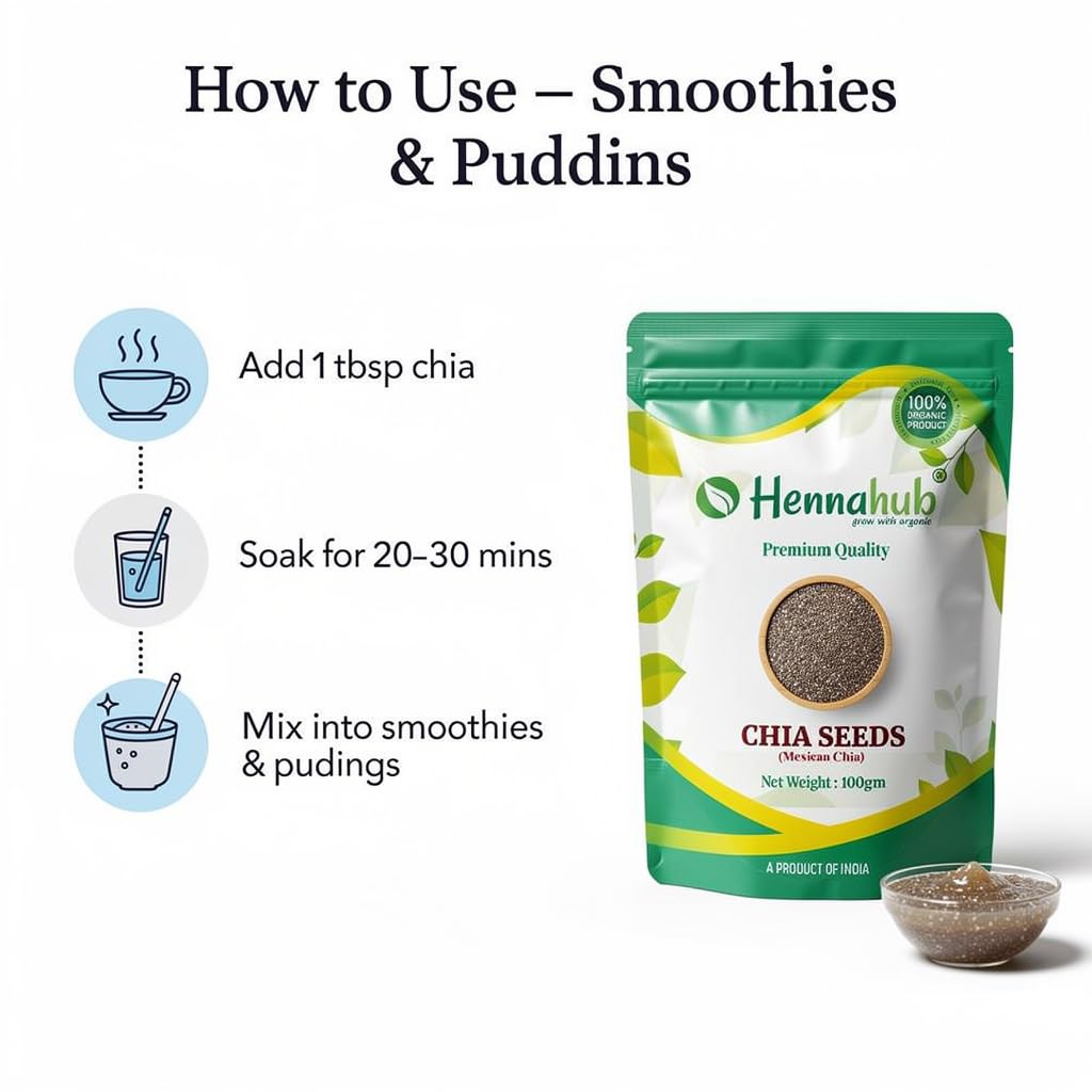 Hennahub Premium Chia Seeds 100g | Raw & Unroasted | Omega-3, Fibre & Protein-Rich Superfood | Gluten-Free Seeds for Smoothies, Puddings, Weight Loss, Salads & Daily Nutrition