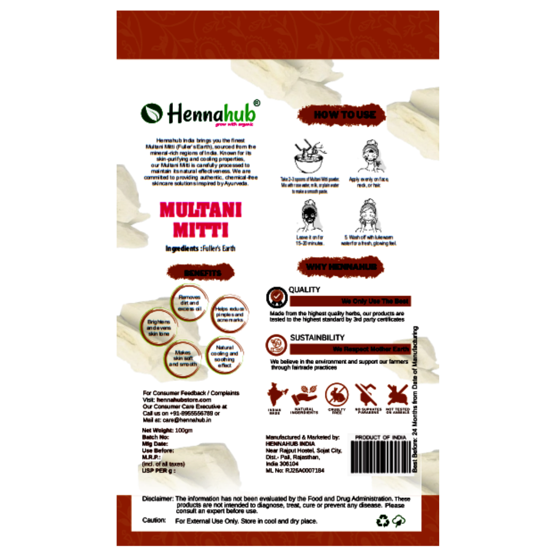 Hennahub India brings you the finest Multani Mitti (Fuller’s Earth), sourced from the mineral-rich regions of India. Known for its skin-purifying and cooling properties, our Multani Mitti is carefully processed to maintain its natural effectiveness. We are committed to providing authentic, chemical-free skincare solutions inspired by Ayurveda