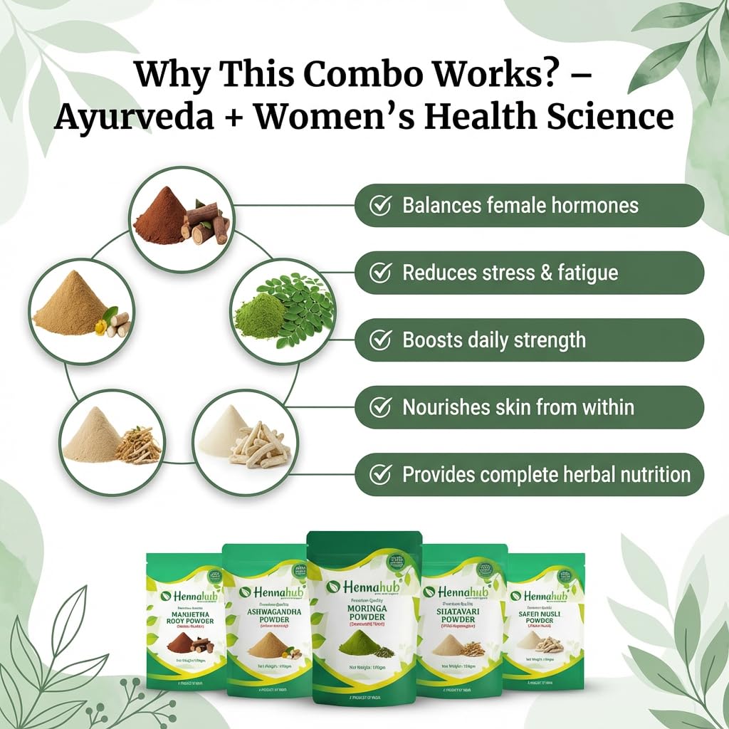 The Hennahub Women's Complete Wellness Combo brings together five powerful Ayurvedic herbs designed to nourish a woman's body from within. This premium pack includes Shatavari, Ashwagandha, Safed Musli, Moringa and Manjistha — all known for their unique roles in supporting hormones, skin health, energy, immunity and emotional balance.